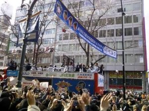 日ハムのパレード 雪が降ってきた。 冬囲いをしないと ...。 でも、今日は日本ハムファイターズの優勝パレードがある。 やっぱり行ってこよう。 大量の紙ふぶきと普段目にすることの出来ない程の人出で、雰囲気を十分に堪能した。 早めに帰って、冬囲いをした。 今年は、時間をかけて丁寧に縄をかけたが、予定通りの時間に終了した。 ものすごく疲れた ...。